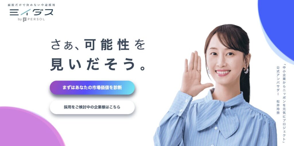 ミイダスは、独自の診断によって、活躍できる可能性がある企業からのスカウトが受けられる転職サービスです。
