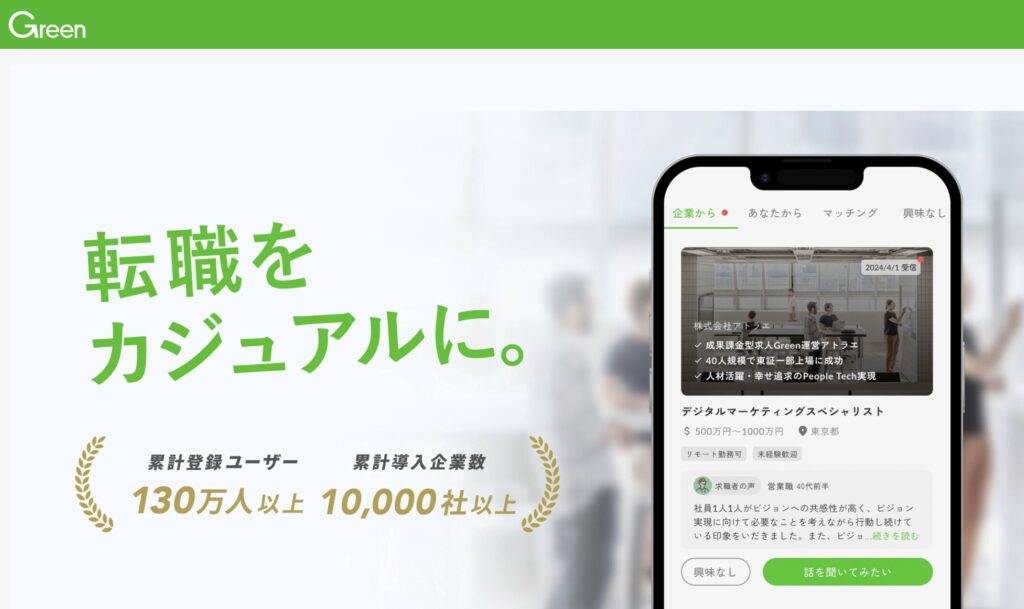 「Green」は、株式会社アトラエが運営するIT・Web業界に特化した転職サイトです。